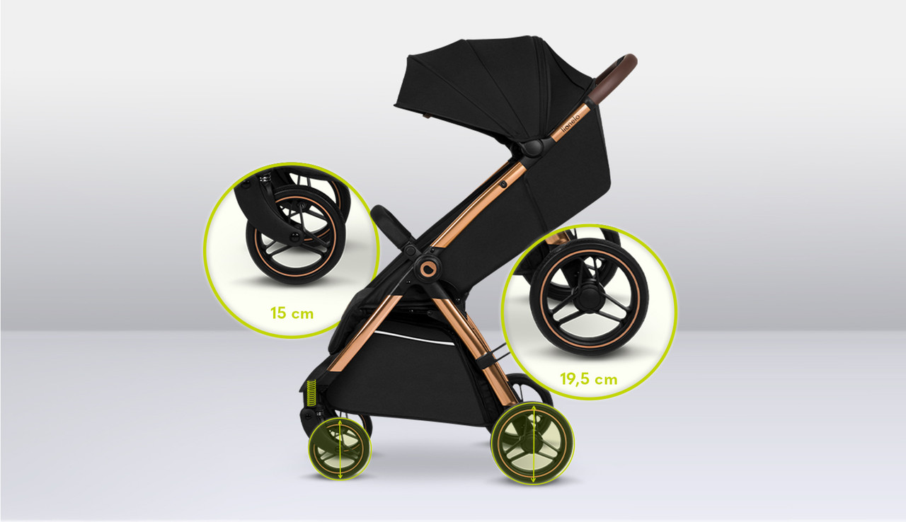 Великі колеса з пінопласту EVA, що не вимагають догляду відрізняються своєю універсальністю – вони легкі та міцні. Можливість обертання на 360° робить колеса дуже маневреними та забезпечує свободу маневрування. Подвійна амортизація – розташована спереду та ззаду, гарантує комфорт навіть при подоланні нерівностей. Коляска має центральне ножне гальмо з сигналізацією.