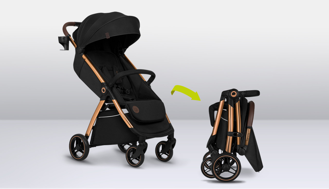 Коляска оснащена системою автоскладання, завдяки якому коляска автоматично складається до компактних розмірів при натисканні кнопки та відпусканні блокування. Весь процес виконується однією рукою.